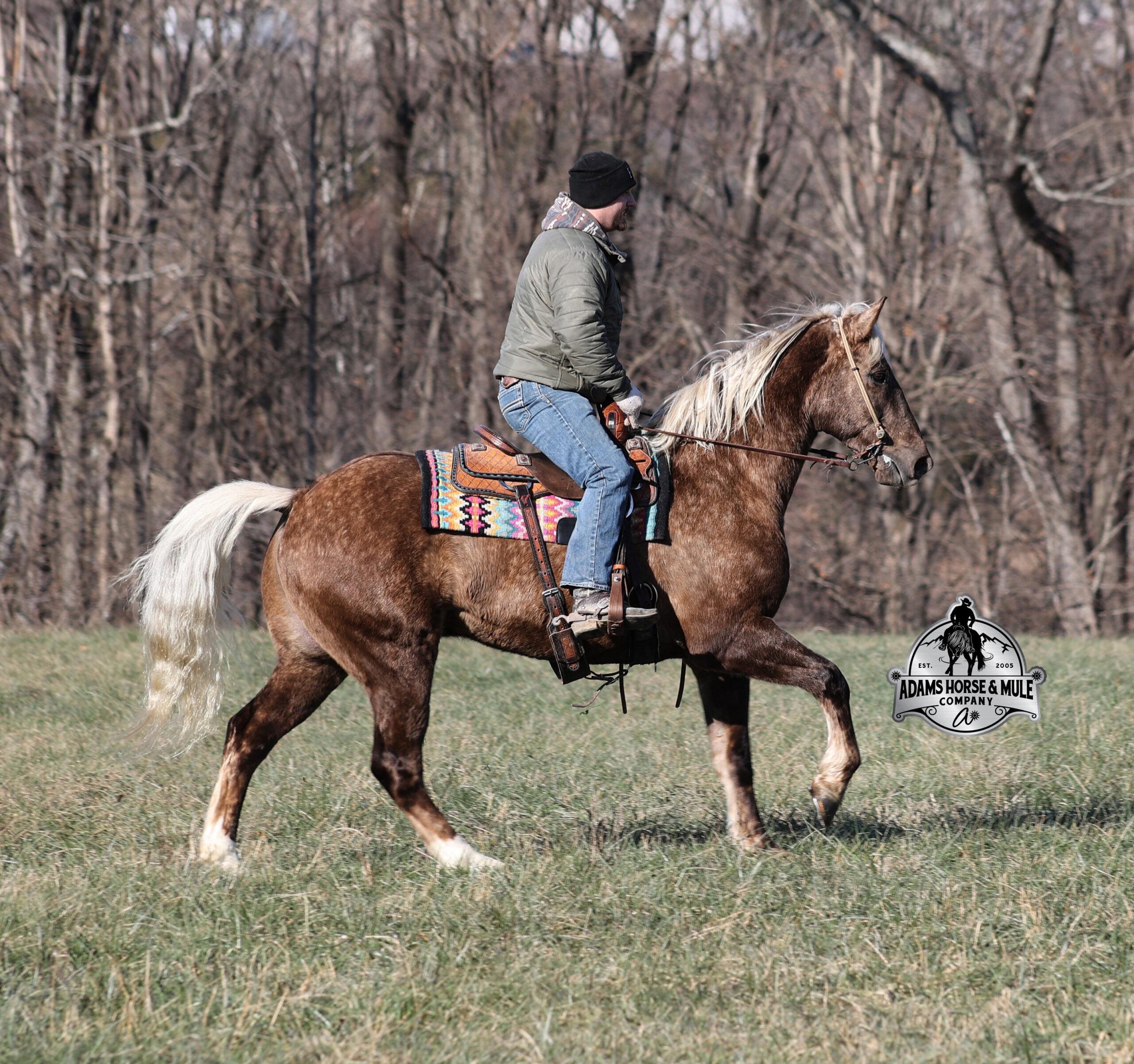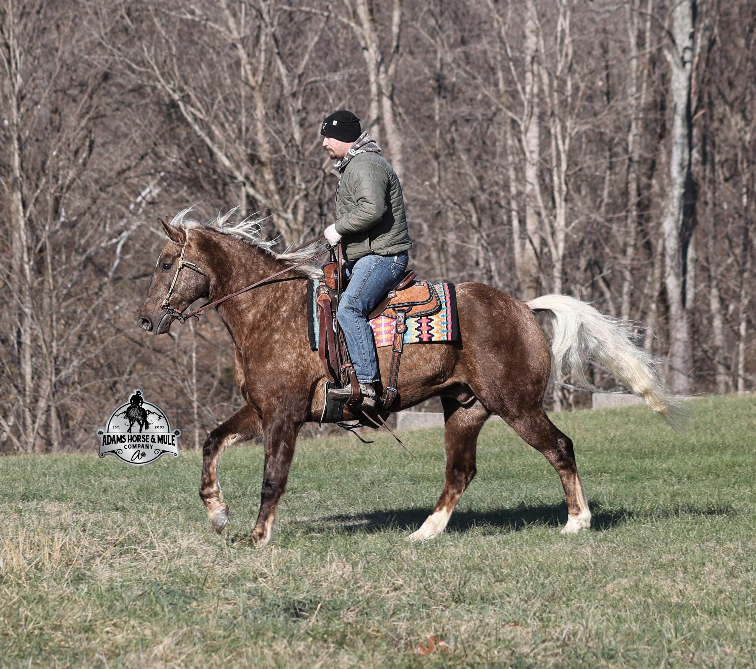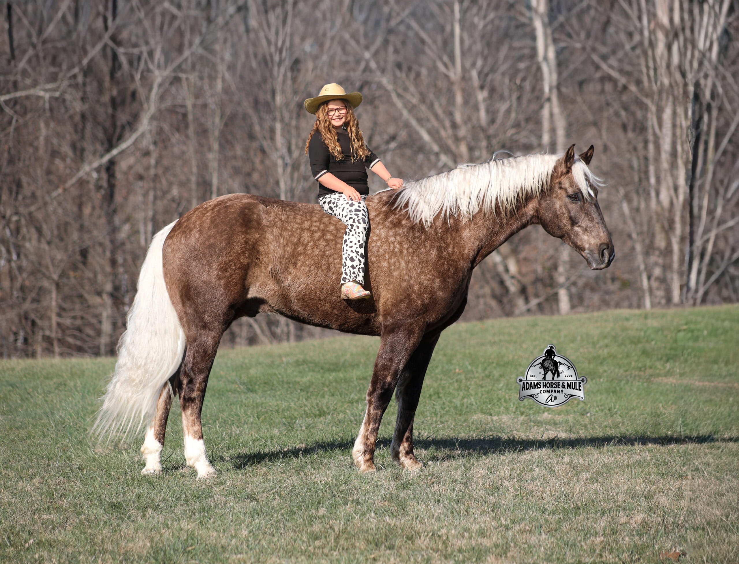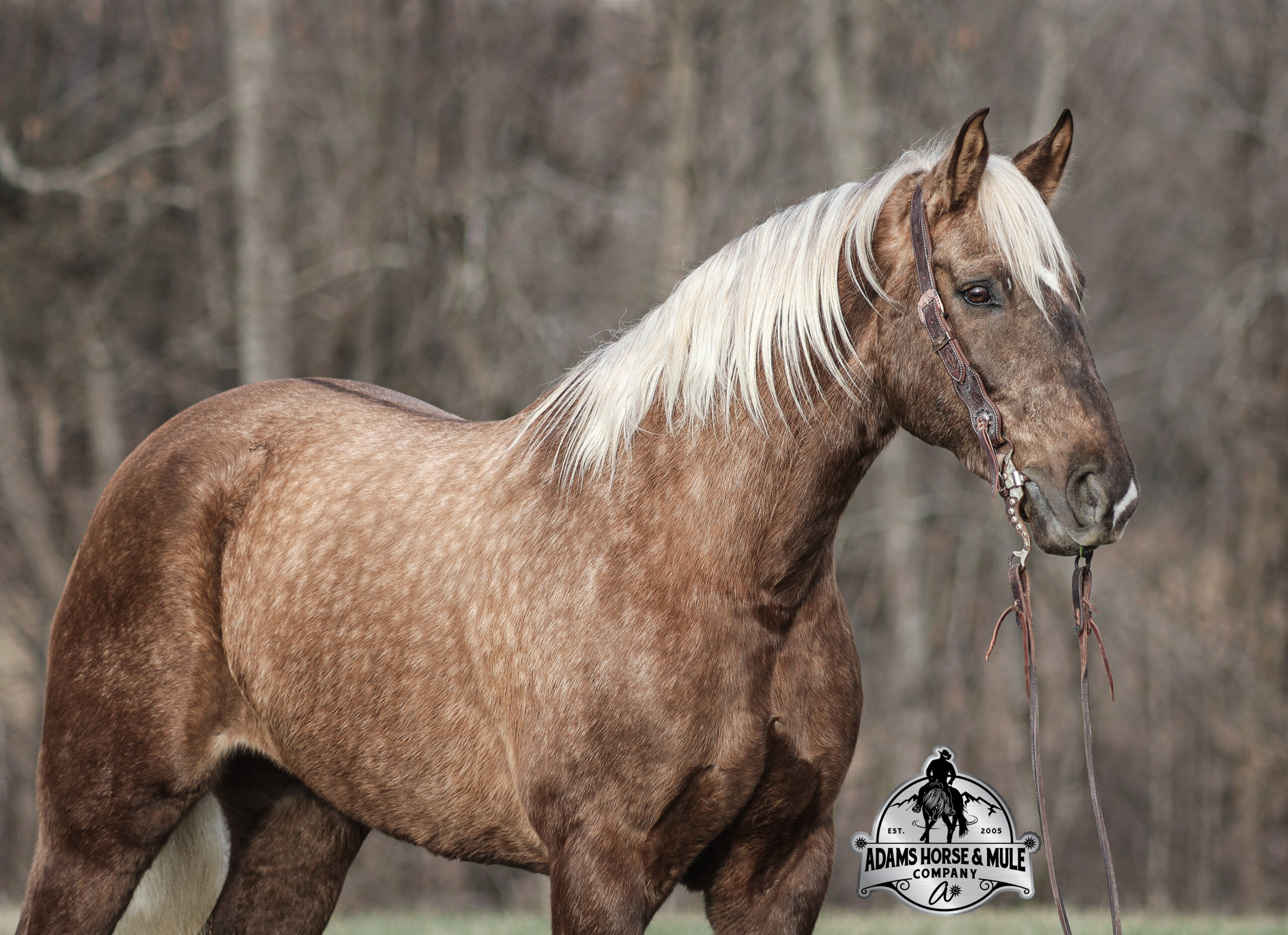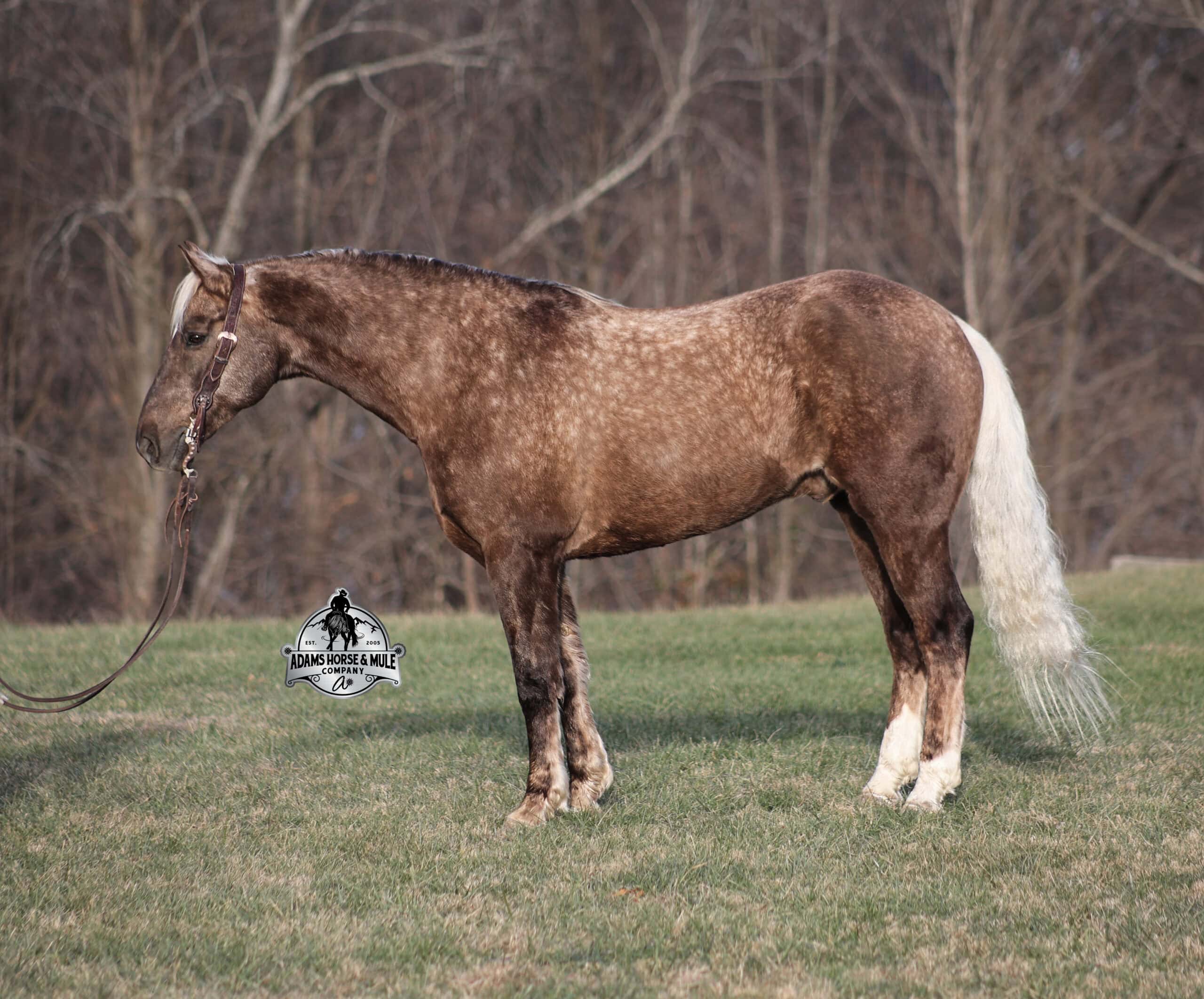 If you have a sweet tooth and just need a little chocolate in your life, Copper is a milk chocolate delight that is suer sweet! He is a magnificent looking 16H+, Silver Dapple(Chocolate) Draftcross gelding that has dapples the size of apples! He is 7 years old and is a sturdy built horse. Copper is one that does a little bit of everything! He is very well harness broke, pulls all farm implements and carriages as well. He has miles and miles of carriage rides under his belt. He’s been ridden around the ranch, checked cows and rode fences. Copper is never in a hurry as he eases along down the trails, he will cross creeks, ditches, logs and navigate rough rocky areas. He picks the safest route and takes his time in tight situations. He has been exposed to all kinds of wildlife and has even packed will game out of the mountains. He is safe in traffic whether that be trucks or cars. He has a nice jog, his lope is smooth as well and he lopes nice circles! He is a horse that will be safe for the whole family to ride and drive. If you have a craving for sweets, get this chunk of chocolate! Feel free to call Eric 606-308-2461 with any questions!