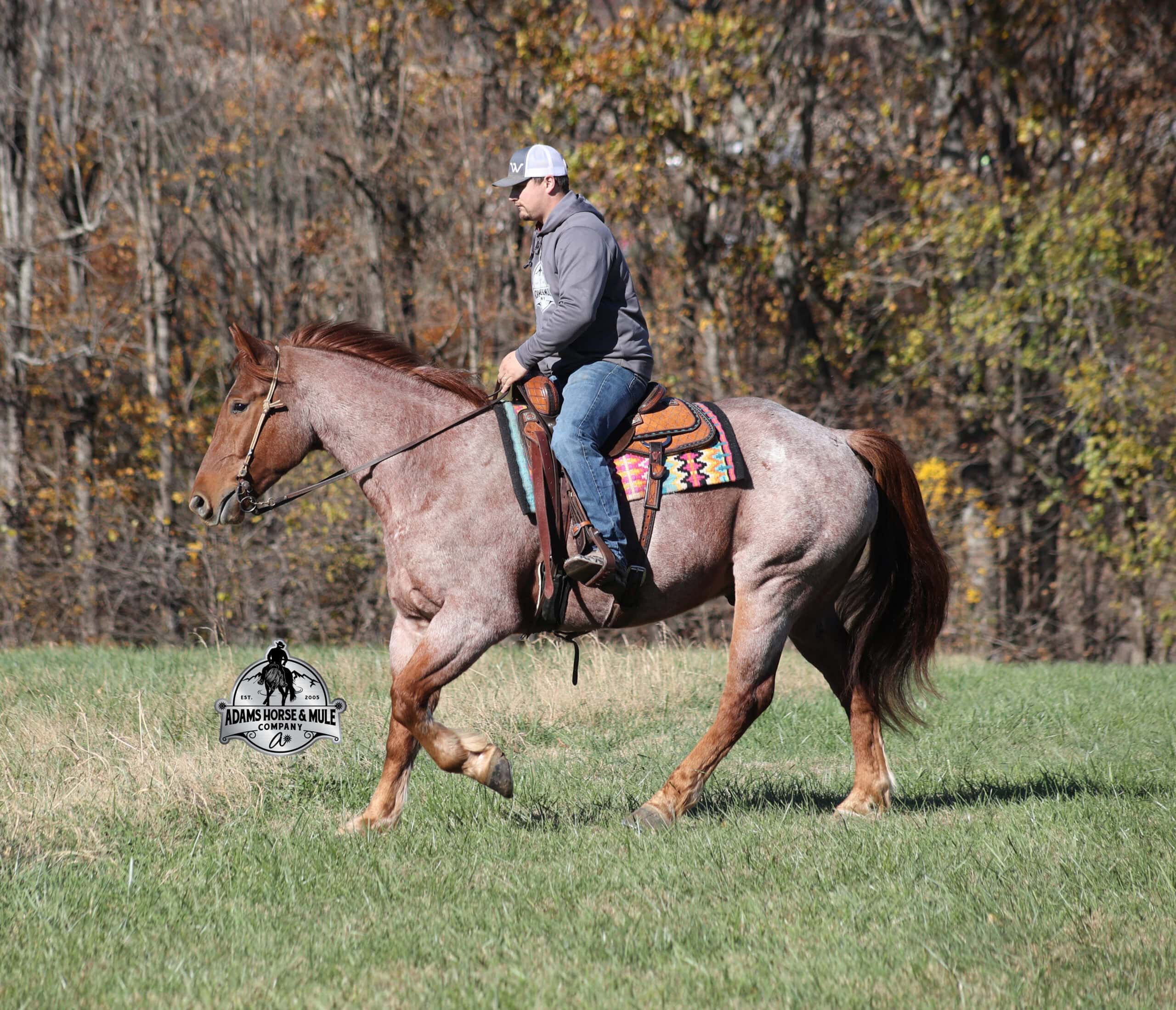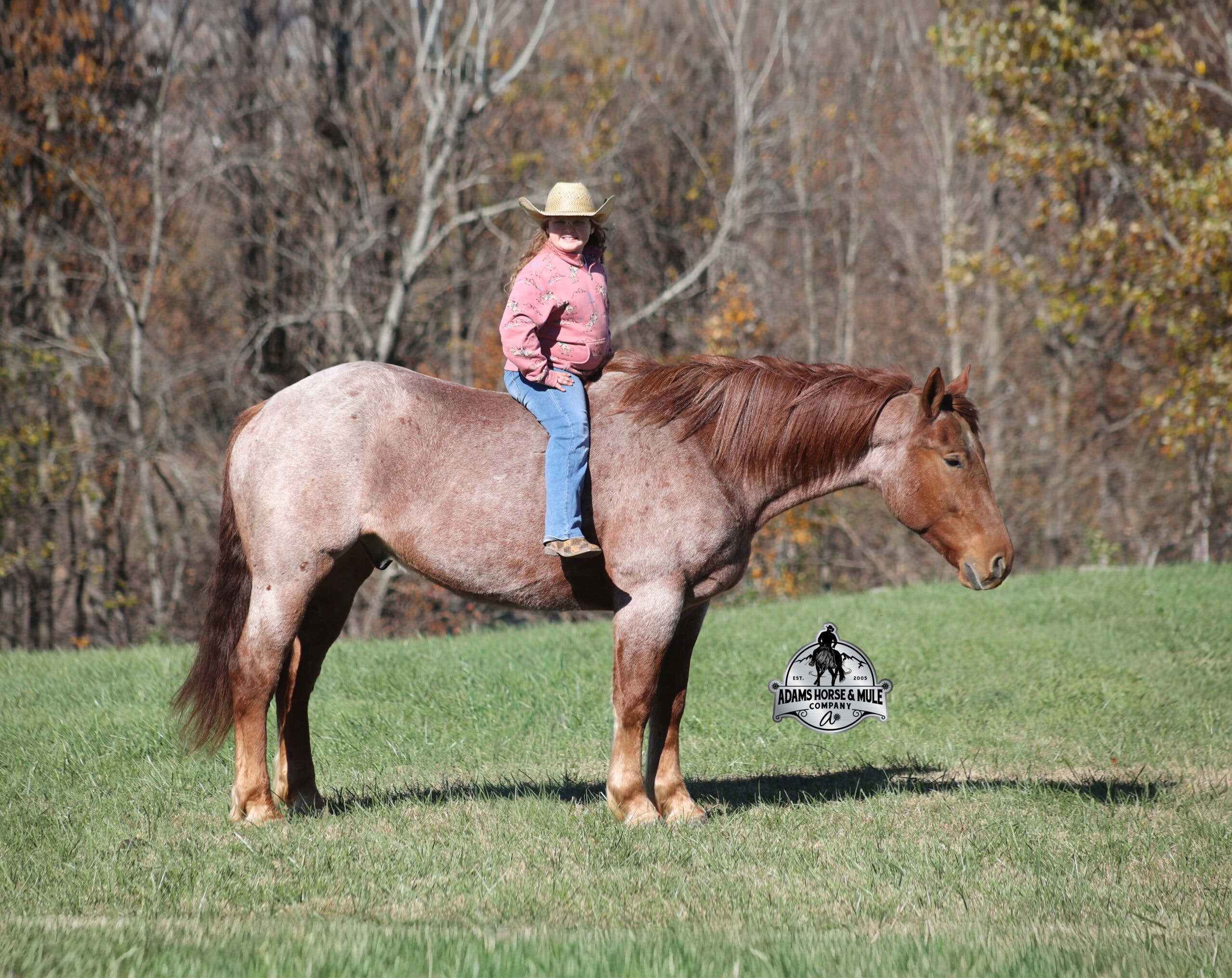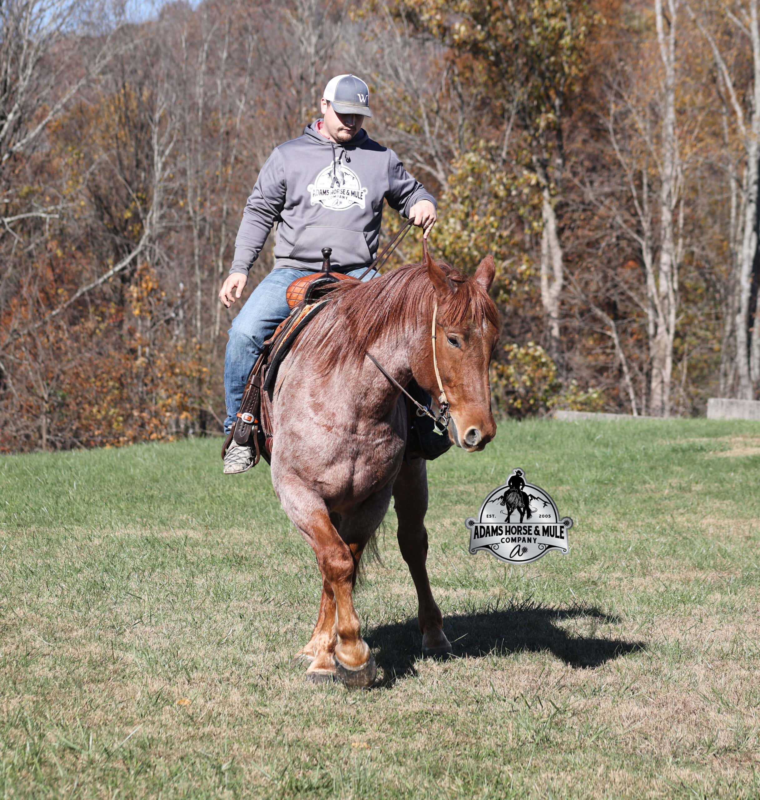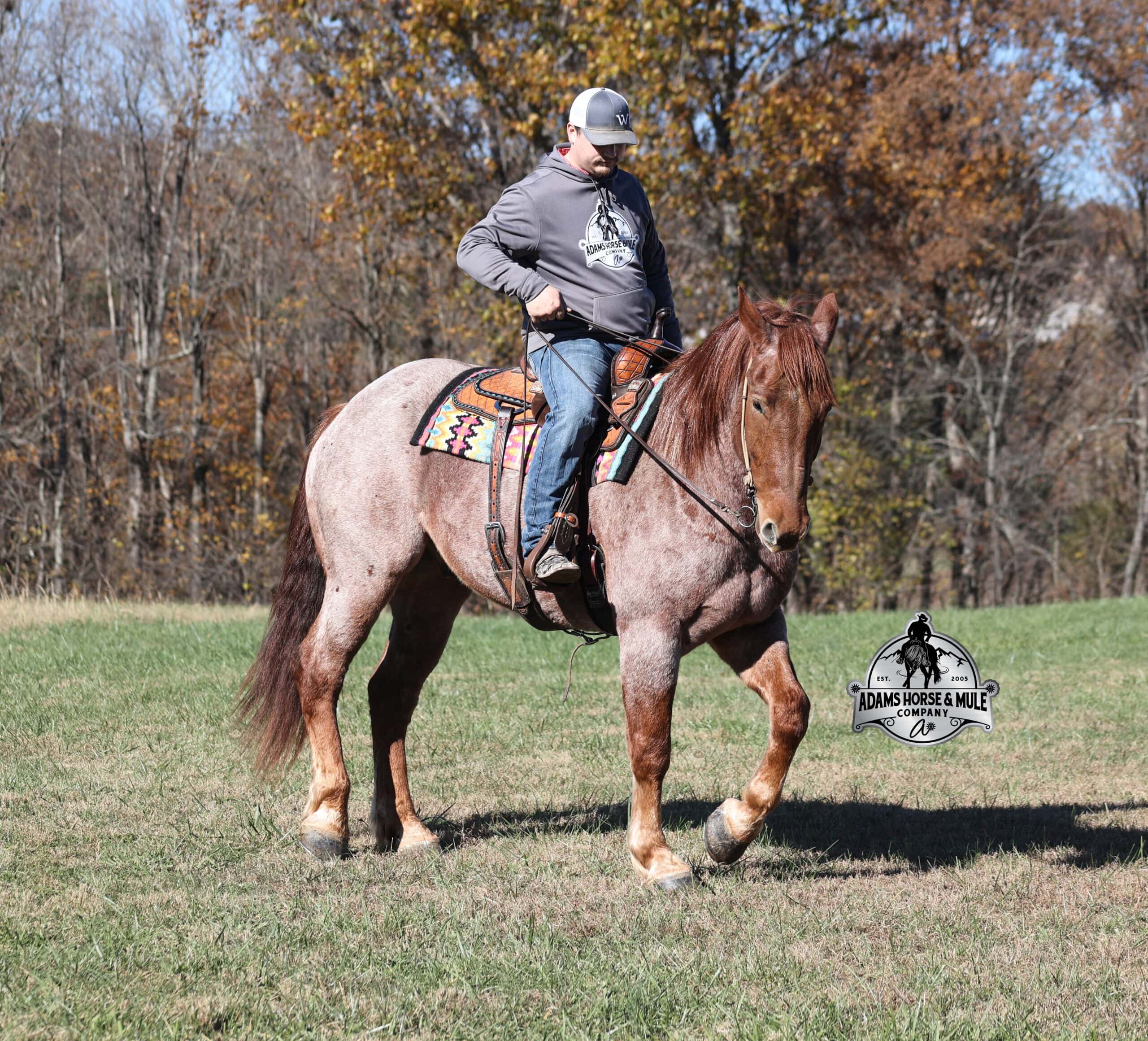Grady is a beautiful true red roan and he will build your confidence levels!!! He is a 16.1h, 5 years old, draft cross Gelding! He is a big stout built guy but he is light on his feet, lopes around as soft and easy as a 14h horse, takes the correct leads, lopes nice circles, reins around and stops with ease! He is totally safe for any age and any level of rider and has been ridden by our 6 year old. He has been ridden inside and out. Grady loves attention and is as friendly as they come plus he is very calm natured! He has been ridden down the highways and he is traffic safe. He is great on trails and he will cross creeks, ditches, logs and navigate rough rocky areas. He has been exposed to all kinds of wildlife such as deer or turkey and will go anywhere that he is asked too. He has been ridden many miles in the mountains of Eastern Kentucky and encountered every obstacle possible on the trail. He has been on several week-long camping trips. He hauls well and picketline ties also. He will go up or down even the steepest slopes, across deep creeks, over downed trees, and over all types of rough terrain while still being sure footed. He has been ridden around the ranch to check cattle, ride fences and used at brandings to drag calves. If you want one that the whole family will love or years to come, Grady is the total package! Feel free to call Eric 606-308-2461 with any questions.