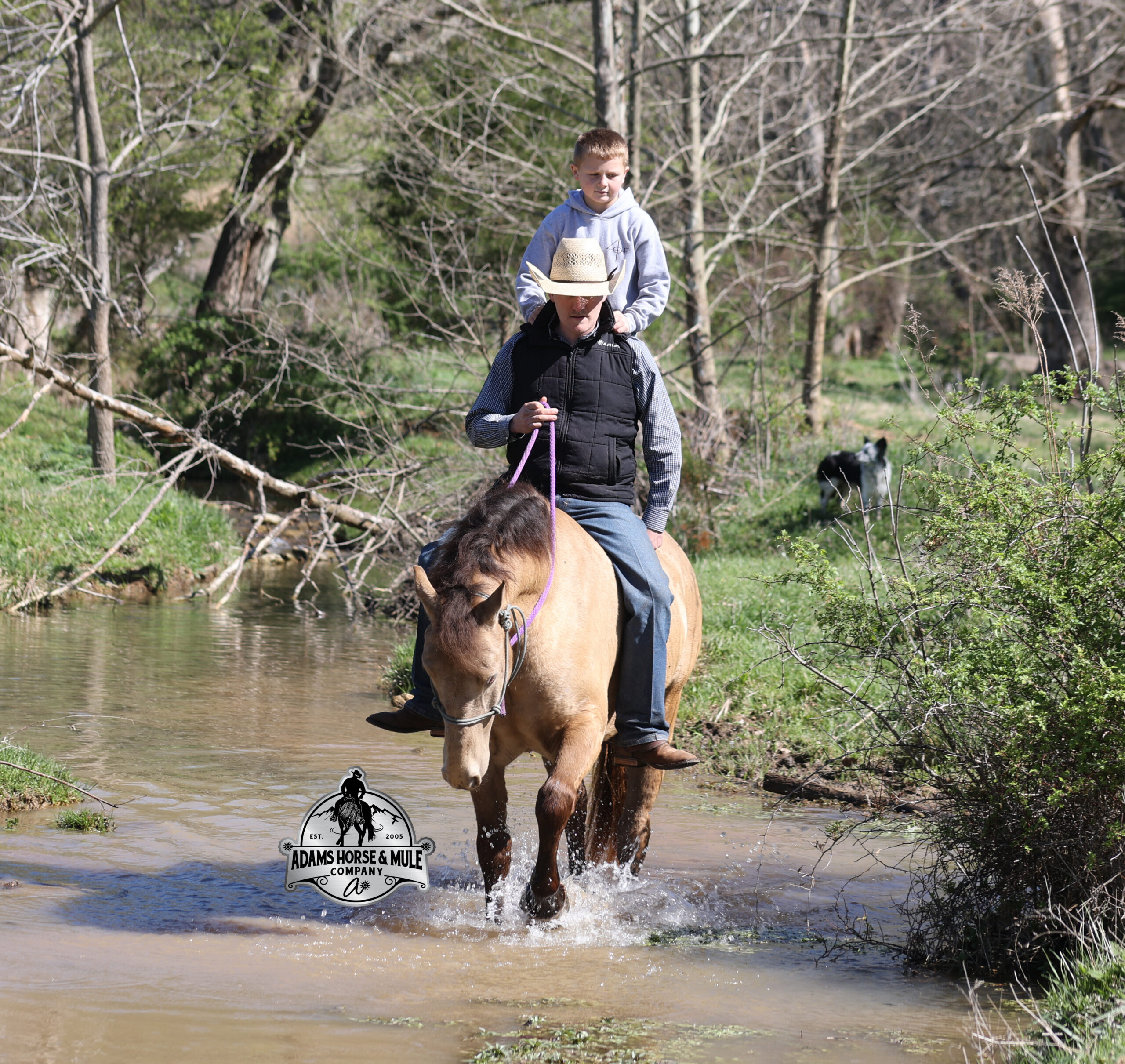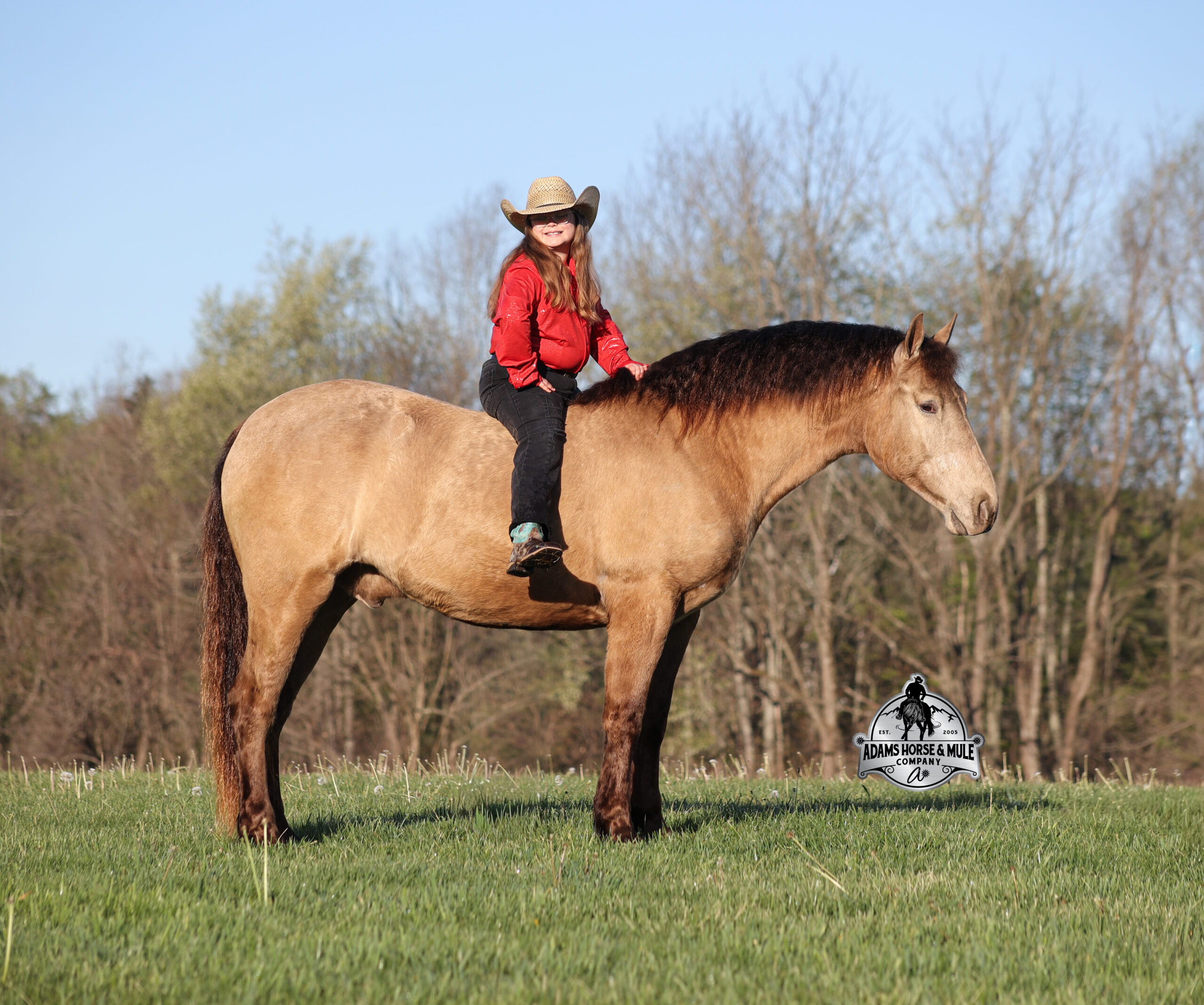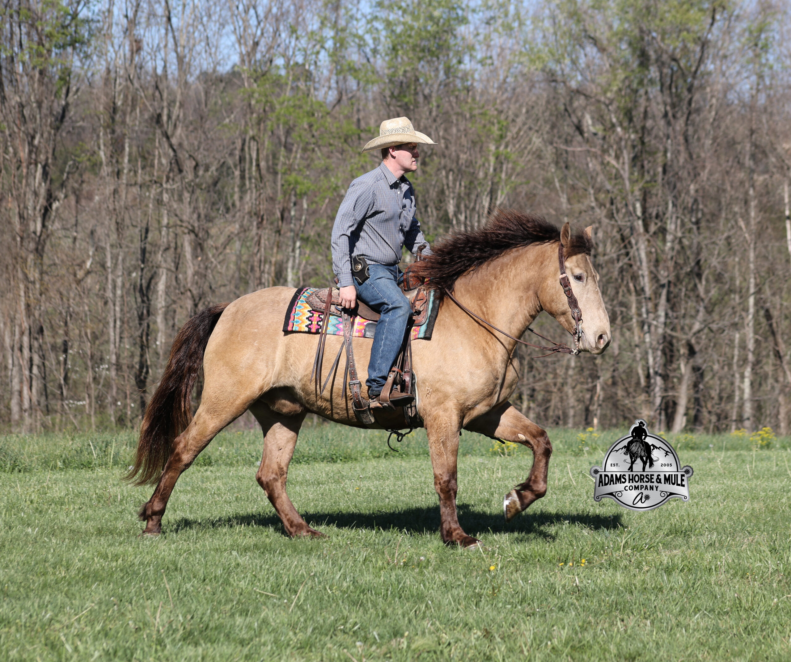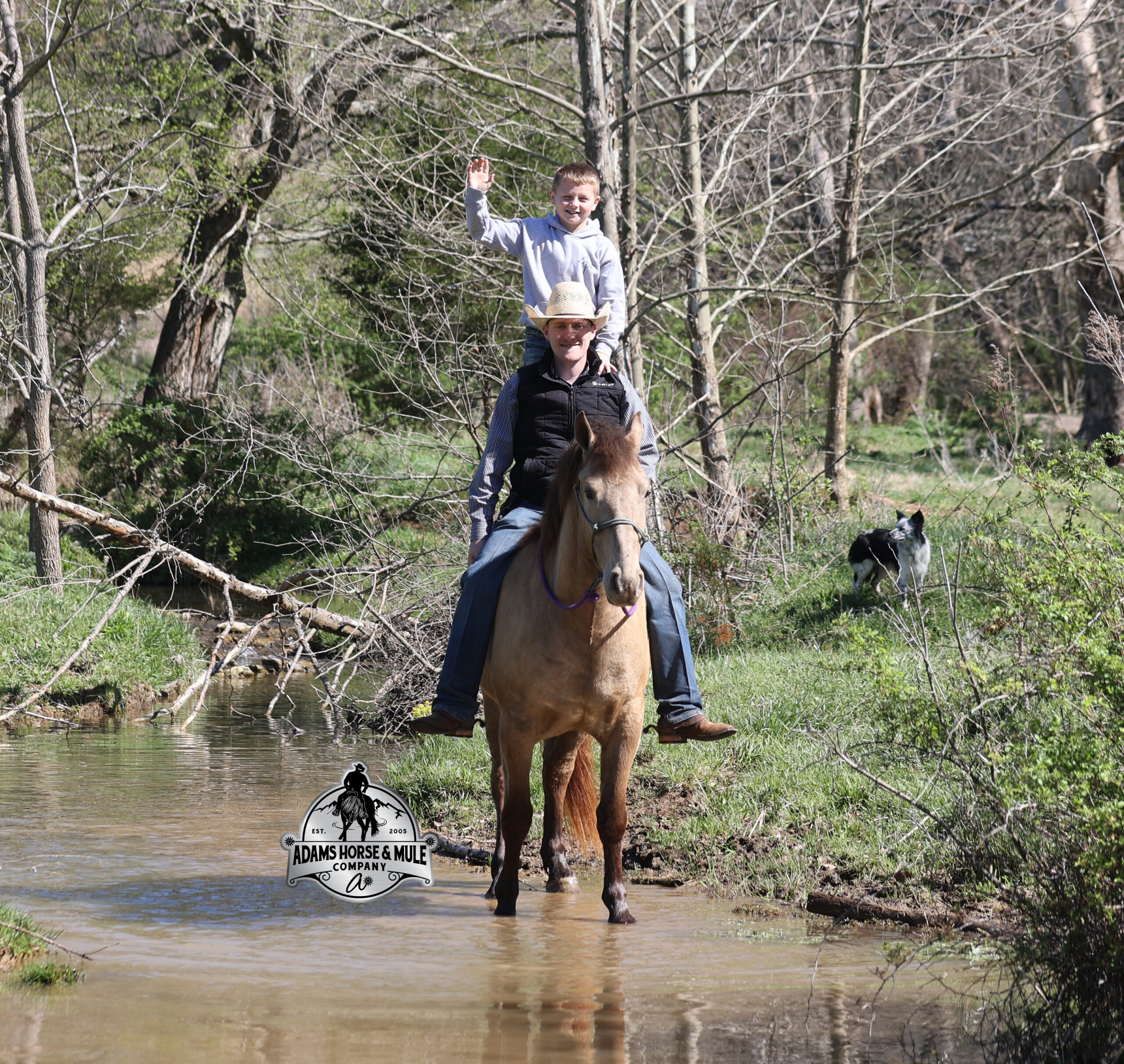 It’s time for a celebration… pop the champagne with this magnificent 15.2H+, ULTRA RARE Champagne Draftcross gelding! He is 6 years old and is VERY sturdy built. Jagger is one that is not only a rare color but rarely do we see one that is this beginner safe, a total confidence builder and one that is the PERFECT horse for the ENTIRE Family! He has been ridden by all ages including our kids. Jagger is one that does a little bit of everything… He’s been ridden around the ranch, checked cows and rode fences. Jagger is a trail riding machine!!! He is never in a hurry as he eases along down the trails, he will cross creeks, ditches, logs and navigate rough rocky areas. He picks the safest route and takes his time in tight situations. He has been exposed to all kinds of wildlife and has even packed will game out of the mountains. He is safe in traffic whether that be trucks or cars. He has a nice jog, his lope is smooth as well and he lopes nice circles! He is very well harness broke, pulls all farm implements and carriages as well. Jagger has been ridden English and geos over the rails with ease. This one horse that we can never say enough good things about and after he becomes part of your family your will agree! Feel free to call Eric 606-308-2461 with any questions!