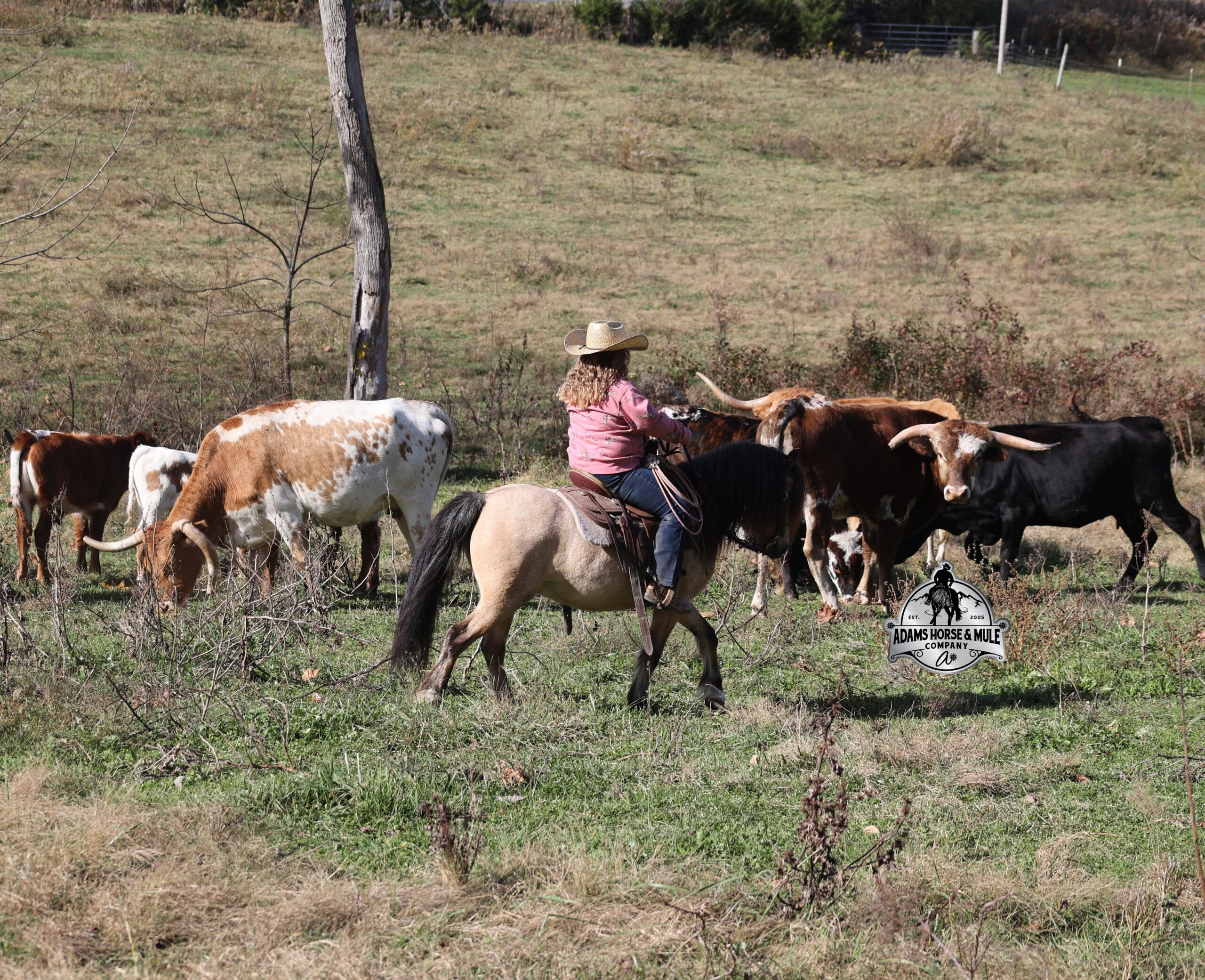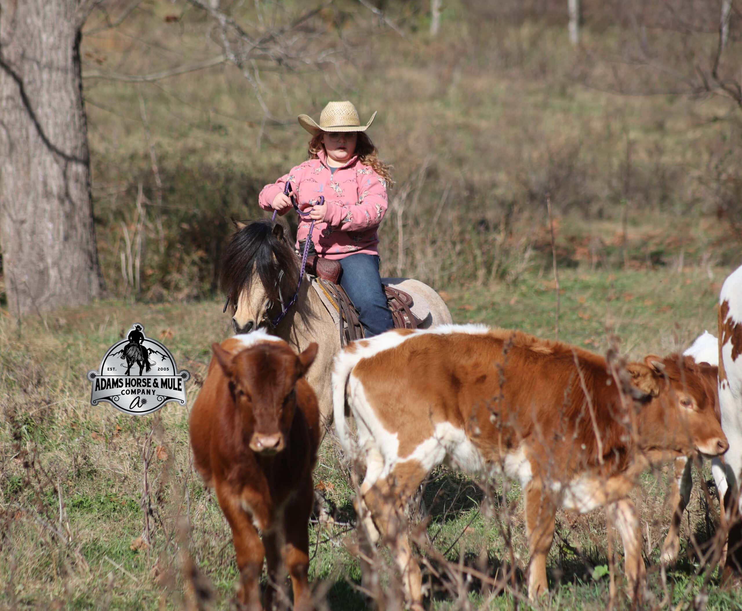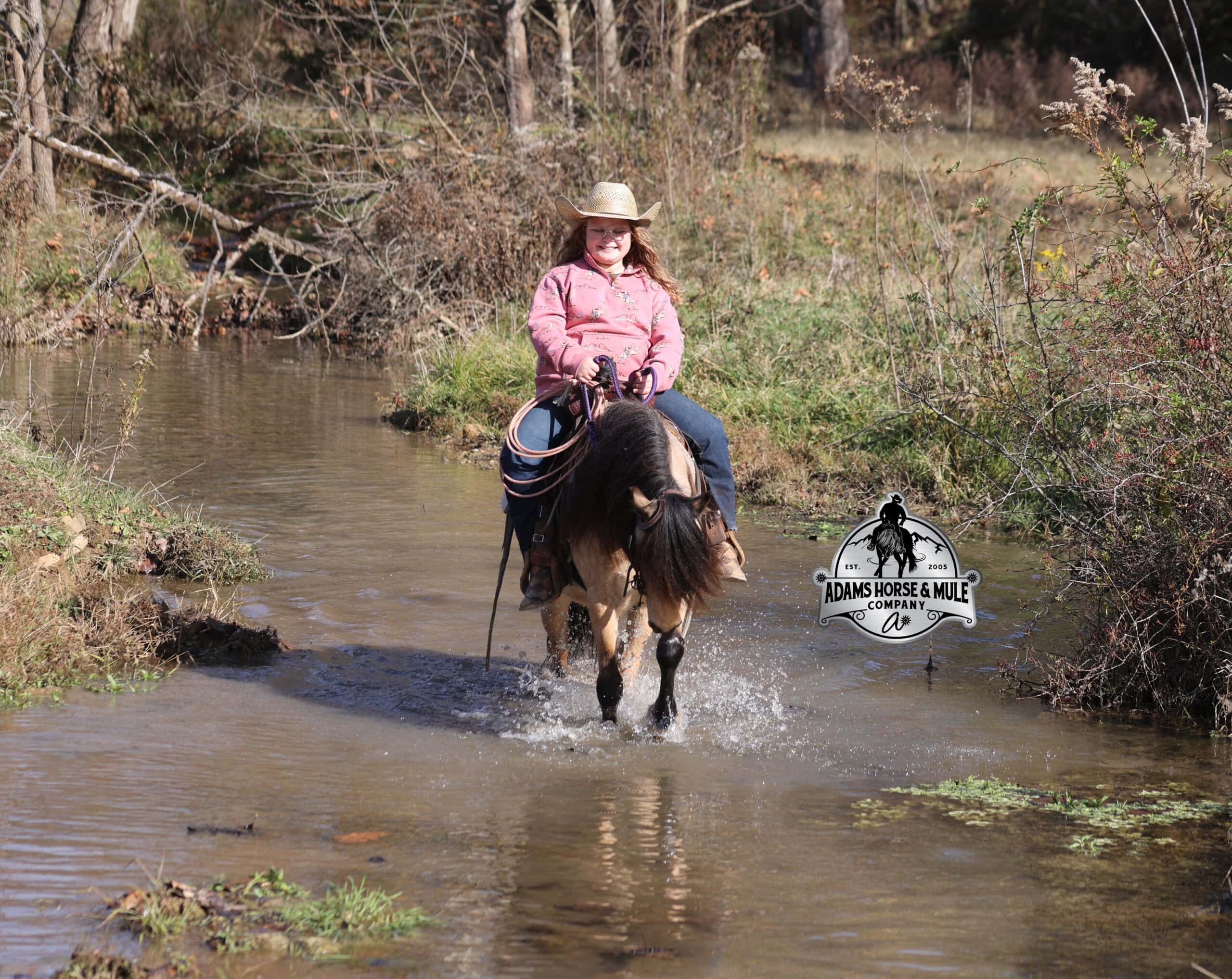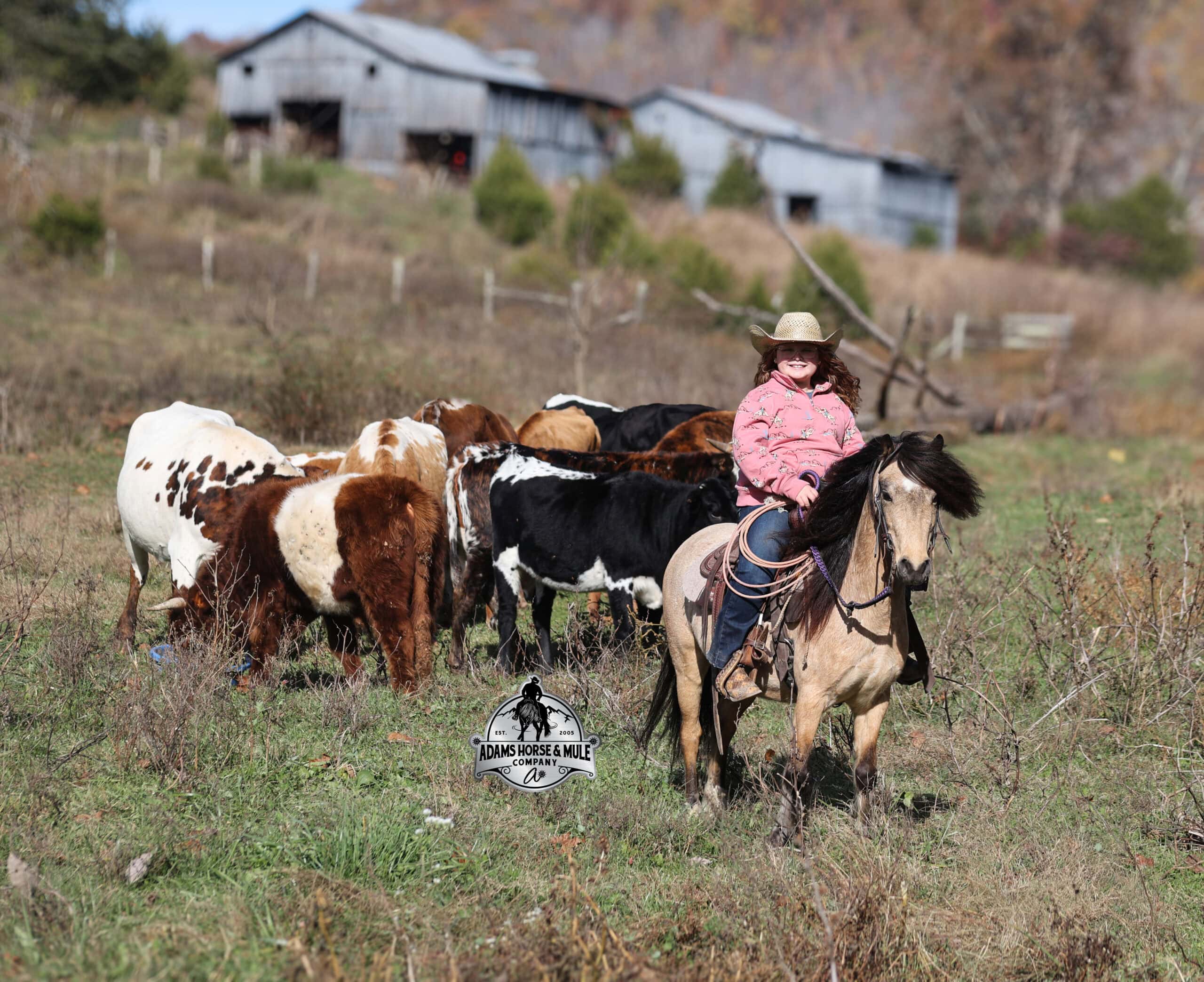 One of the bittersweet things about having children is seeing them grow up before your eyes and as I have come to find out they grow up too quickly! From first steps to running wild, from first ride to first pony and now, as much as it breaks dad’s heart, we are at that crossroads with Lynnlee of going from first pony (Keychain) to first horse. Keychain has been Lynnlee’s first pony that she rode all on her own, her “Big Girl” pony. The one that we never worried about when she headed out alone, the one that she just went and caught on her own, spent hours brushing, braiding, putting mane and tail products in his mane (they worked as you can see). Keychain has been her real life Barbie pony that she has played with virtually every day after school and all summer long. We could never thank this pony enough for all that he has done for building Lynnlee’s confidence as a rider, Keychain is a once in a lifetime pony, a true unicorn… Keychain is a 11.2h, stout built, 5 year old, quarter pony and he is that amazing buckskin color! He is every little boy’s or little girl’s dream come to life! Keychain has been Lynnlee’s whole world for the last two years and now it’s time to move him along to another family and let him do his job of teaching some other kids how to ride while setting them on the path of many years of success in the saddle. Keychain has the experience that is needed and he is the perfect size to carry any size kid. (For reference) Lynnlee is 8 years old and 4 foot 9 inches tall. Keychain is responsible for millions of smiles, thousands of giggles, and countless miles and hours of fun with his best pal Lynnlee… all while doing it flawlessly, completely safe and as close to perfection as a horse can get. Even early on before Keychain gave Lynnlee the confidence that she has now, he would tolerate her mistakes with the reins, he would never take advantage of her and was very patient. In no way, shape or form has or will Keychain ever be head strong or spoiled acting, he is ALWAYS super agreeable and easy going. Confidence comes easy with him as he is one hand broke, he neckreins around and goes anywhere that you point him, he walks quietly but moves out when asked. Keychain has the absolute best lope of any pony that I have ever saw, it’s like he just floats on air without touching the ground, so soft, so smooth, he takes the correct leads and will lope out of his tracks from a stand still. He just floats along slow and easy while on a complete loose/draped rein or with the reins dropped on the saddle horn. Keychain has been used at a couple different rodeos for pony rides and in one night we had over 100 kids of all ages ride him. He was a perfect gentleman and super patient with some of the special needs kids. He has been ridden through town, is traffic safe, ridden around cows and down the trails. He is a trail riding machine and will take the little riders safely anywhere that the adults can go… creeks, ditches, crosses logs, picks his way through deadfall or rocky paths… he is very sure footed and is not in a hurry! Keychain will ride out alone, leave the barn behind with no issues, will ride in the front of a group or way back behind everyone without a fuss. Keychain is the same horse whether ridden daily or if he is left in the stall or pasture for a few months during the winter. Keychain is very friendly and loves to be groomed, whether that is standing patiently for an hour so Lynnlee can braid every hair that he has or getting soaked with a hose and scrubbed with a half of a bottle of shampoo… Keychain is the perfect kid’s horse, with his patients, confidence, rideability… do your little one a favor and make sure that Keychain’s next home is with them! For more info call 606-308-2461.